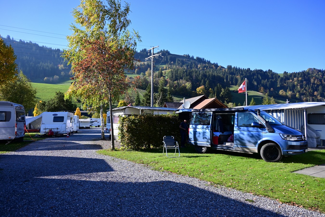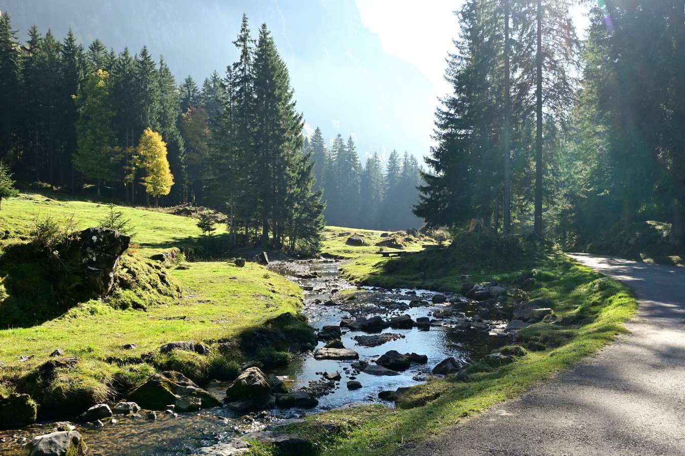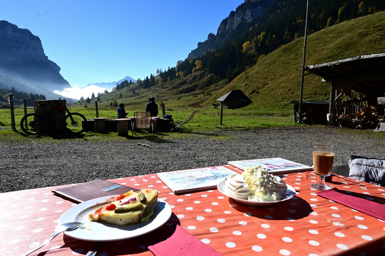 Am nächsten Tag verlassen wir nach einem gemeinsamen Frühstück Thun und fahren ins Justistal. Leider ist die Zeit der Hirschbrunft praktisch vorbei, aber dennoch lockt uns dieses sehr schöne Tal. Mit dem Auto fahren wir hinauf bis zu einem grossen Parkplatz mit Picknickplatz. Die Nebelgrenze haben wir so knapp hinter uns gelassen. Die Sonne begrüsst uns und dies tut uns sehr gut. Ein Spazierweg führt uns in 30 Minuten zu «Lilis-Beizli». Wunderschön an der Sonne geniesst Urs einen grossen Merengue-Dessert und ich einen feinen Käsetoast. Man könnte noch lange hier sitzen, doch wir müssen uns noch einen Übernachtungsplatz suchen. In der Nähe von Interlaken werden wir mit dem Campingplatz Alpenblick fündig.