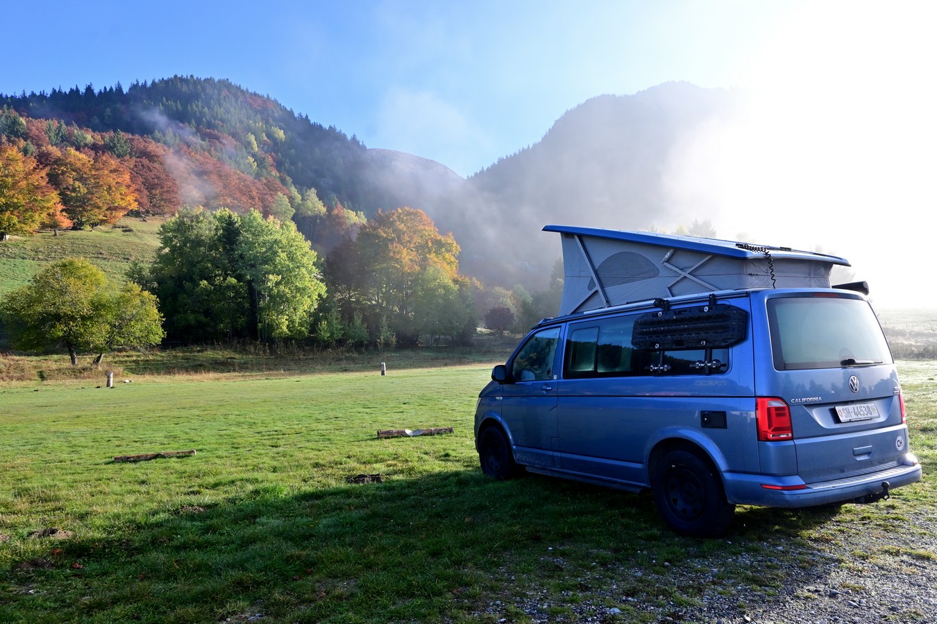 Erst in der Nähe von Lausanne entscheiden wir, ob wir die restlichen 5 Tage unserer Herbstferien im Wallis verbringen wollen oder in Südfrankreich. Löst sich der Nebel oder nicht, ist im Herbst immer wieder ein Thema. Wir entscheiden uns auf Nummer sicher zu gehen und für ein bisschen mehr Wärme. Unsere Reise geht somit über Genf nach Frankreich. Bis Grenoble fahren wir auf der kostenpflichtigen Autobahn, danach wählen wir die Route Napoleon, die N85, welche von Grenoble durch die Alpen bis ans Mittelmeer führt. Die Strasse ist uns nicht unbekannt, aber es ist seit dem letzten Mal schon eine Weile her. Wo schlussendlich unser Ziel liegt, wissen wir noch nicht. Wir lassen uns einfach mal treiben. In der Nähe von Grenoble übernachten wir nach kurvenreicher Strasse in den Bergen auf einem schönen Stellplatz. Von der Umgebung sehen wir momentan wegen des Nebels nicht viel. Am nächsten Morgen freuen wir uns an der durchdringenden Sonne.