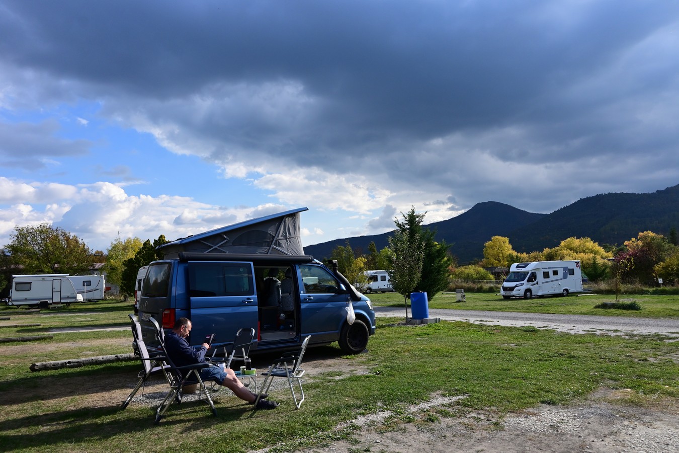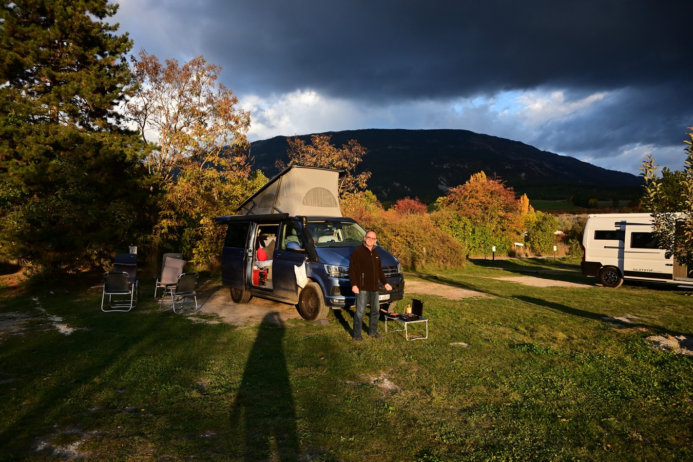 Mit den letzten Sonnenstrahlen und schönen Stimmungen kommen wir erst bei Dunkelheit um 19h30 auf unserem Stellplatz in Saint-Bonnet-en-Champsaur an.