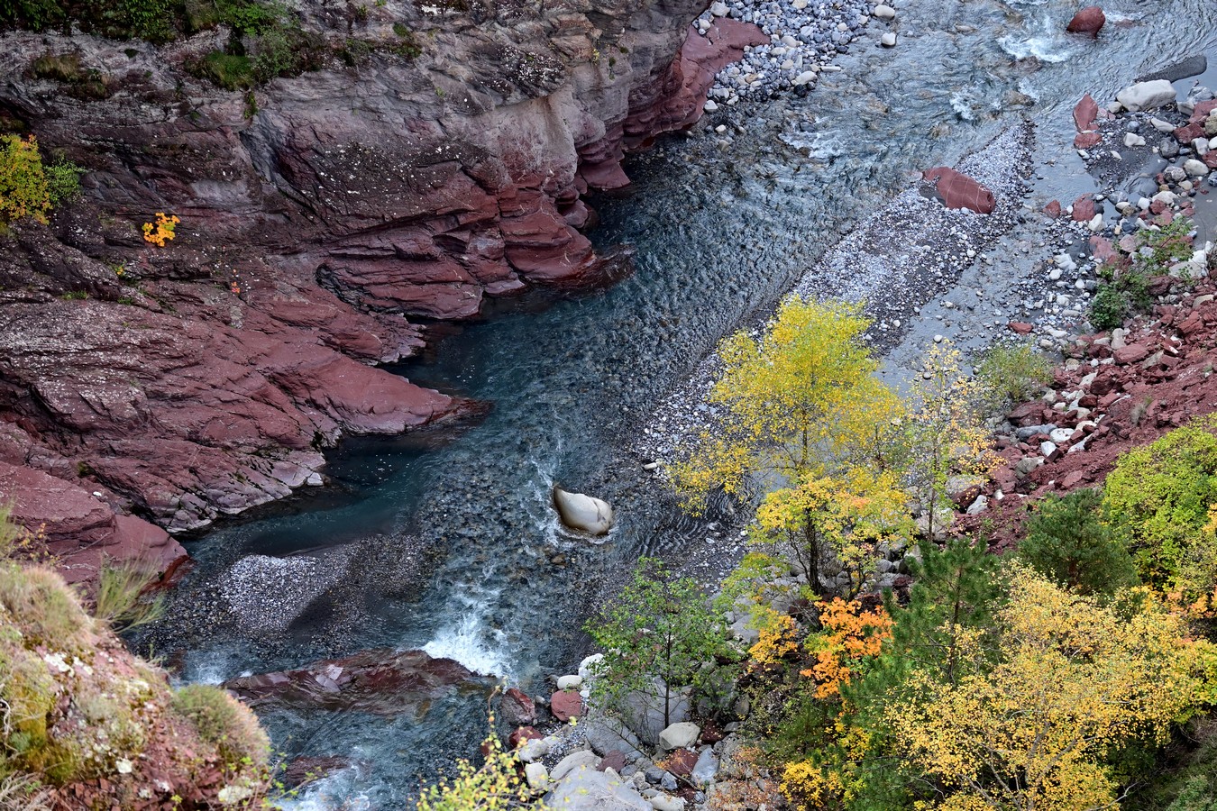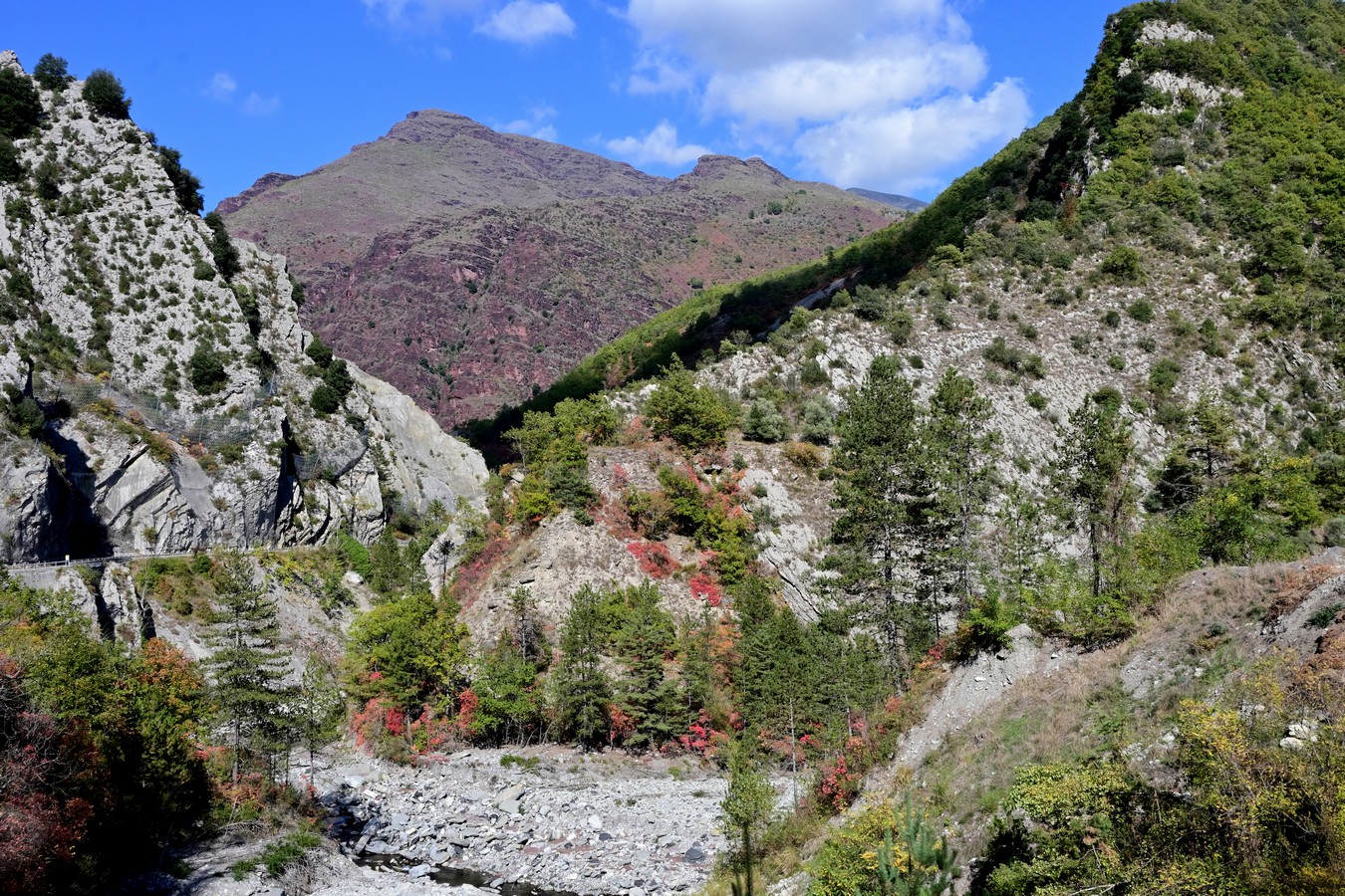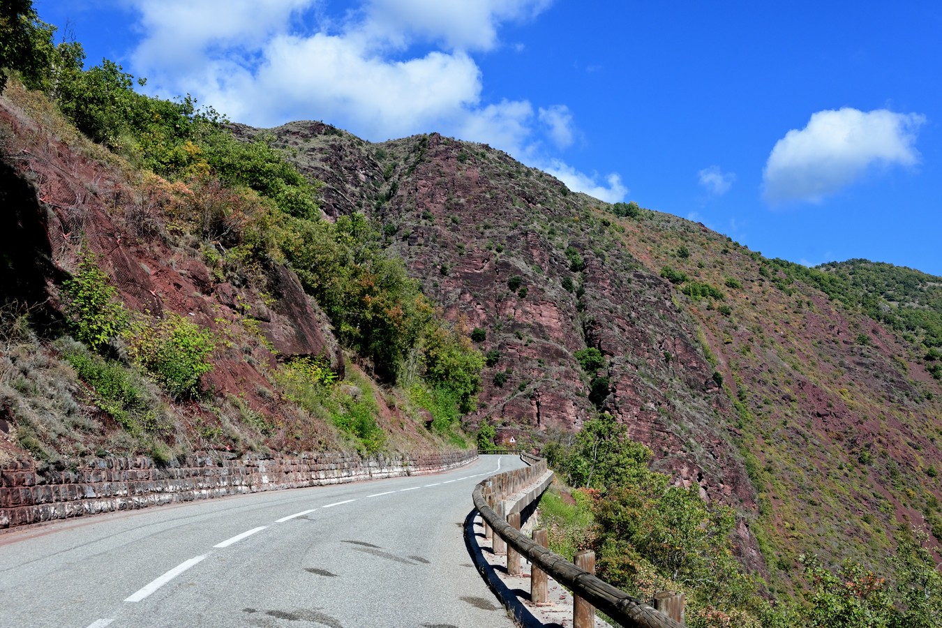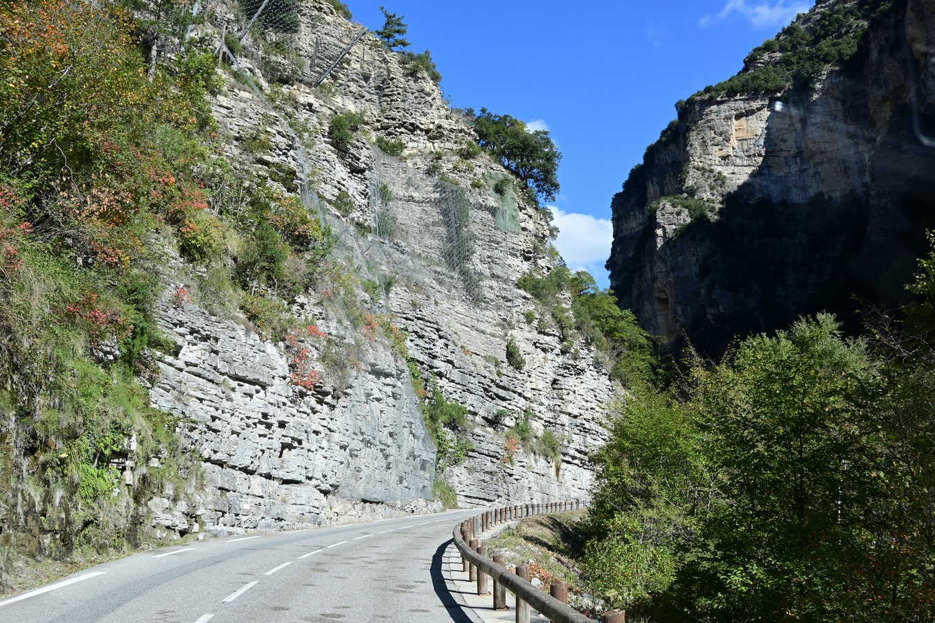 Die Landschaft der Schlucht «Gorges du Cians» fasziniert uns. Auch hier fahren wir durch rotes Gebirge, welches im Sonnenlicht und mit blauem Himmel sehr schön wirkt. Wir machen etliche Fotostopps und von einem kleinen Parkplatz aus kann man einige Meter auf der alten Strasse, abseits der heutigen Strasse der Schlucht entlang spazieren. In dieser Schlucht ist man nahe beim Fluss, welcher durch die Schlucht fliesst, im Gegensatz zu der «Gorges de Daluis», durch die die Strasse weit oben entlang verläuft. Am Ende wenden wir und fahren den gleichen Weg durch die Schlucht zurück. Diese imposante Gegend werden wir sicher wieder einmal besuchen.