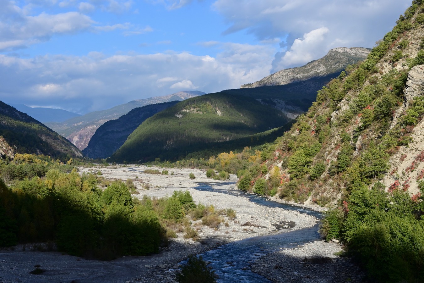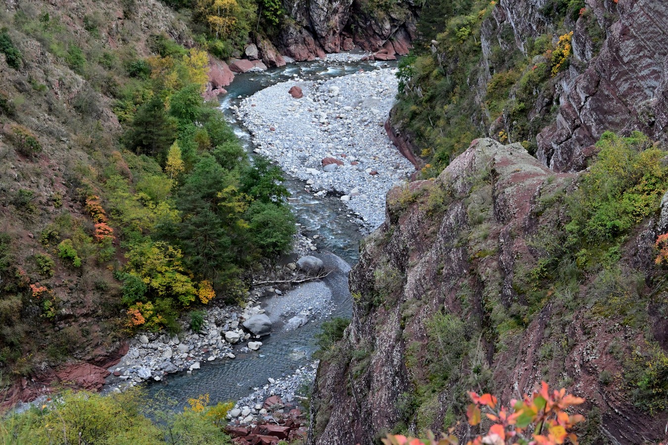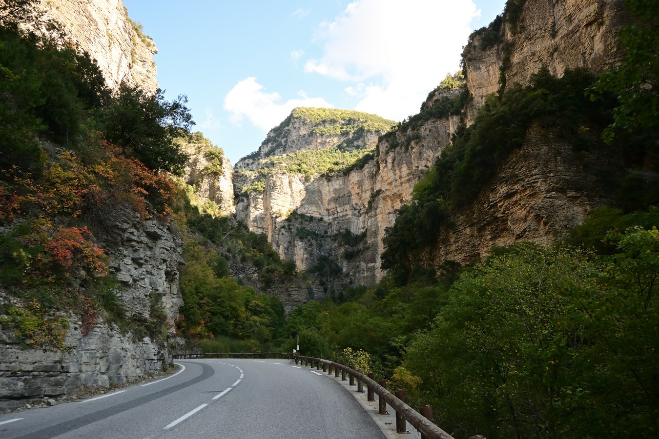Die Landschaft der Schlucht «Gorges du Cians» fasziniert uns. Auch hier fahren wir durch rotes Gebirge, welches im Sonnenlicht und mit blauem Himmel sehr schön wirkt. Wir machen etliche Fotostopps und von einem kleinen Parkplatz aus kann man einige Meter auf der alten Strasse, abseits der heutigen Strasse der Schlucht entlang spazieren. In dieser Schlucht ist man nahe beim Fluss, welcher durch die Schlucht fliesst, im Gegensatz zu der «Gorges de Daluis», durch die die Strasse weit oben entlang verläuft. Am Ende wenden wir und fahren den gleichen Weg durch die Schlucht zurück. Diese imposante Gegend werden wir sicher wieder einmal besuchen.