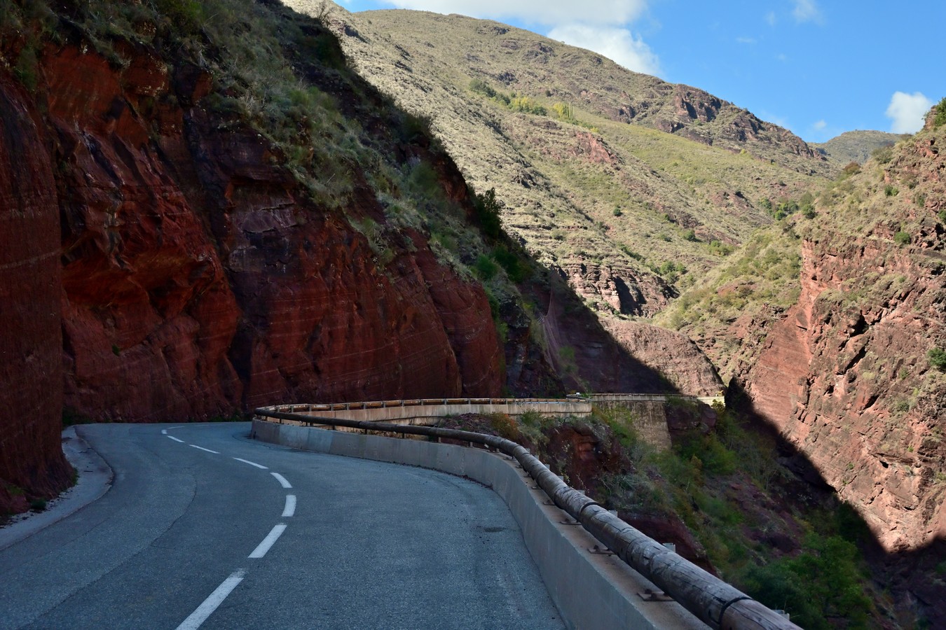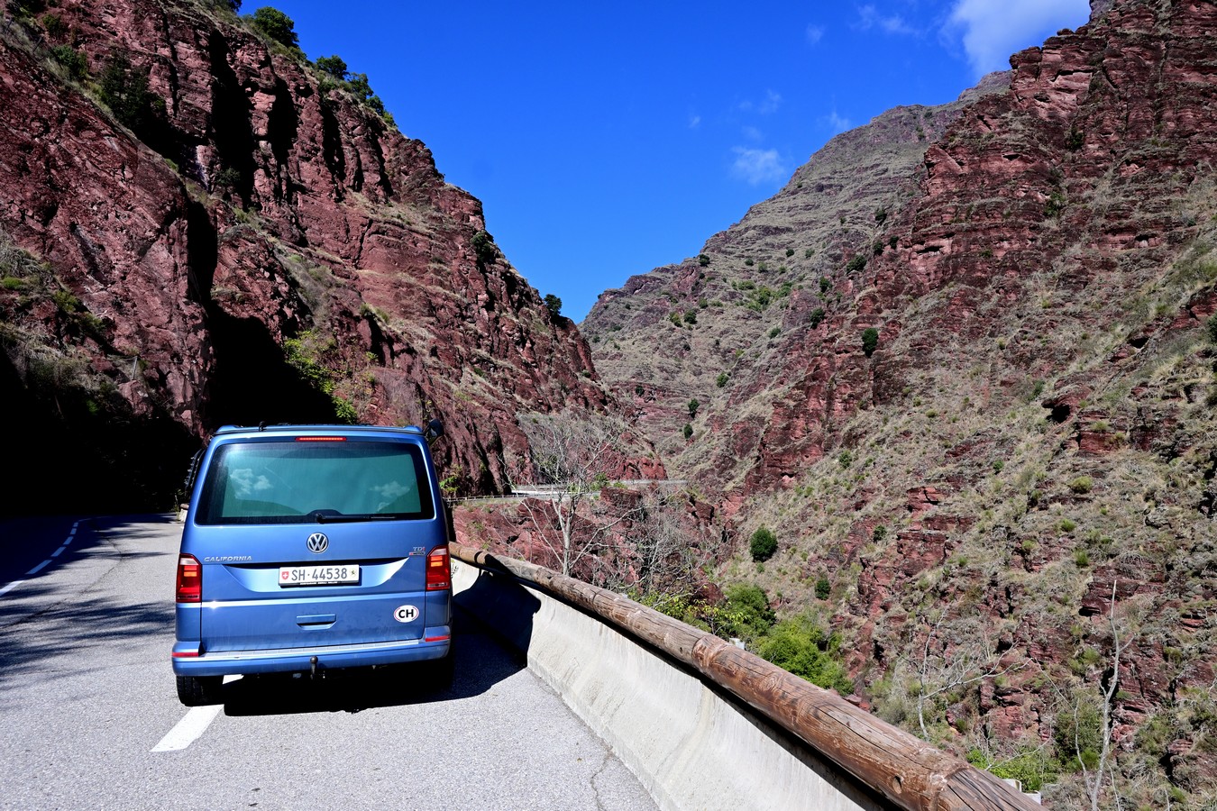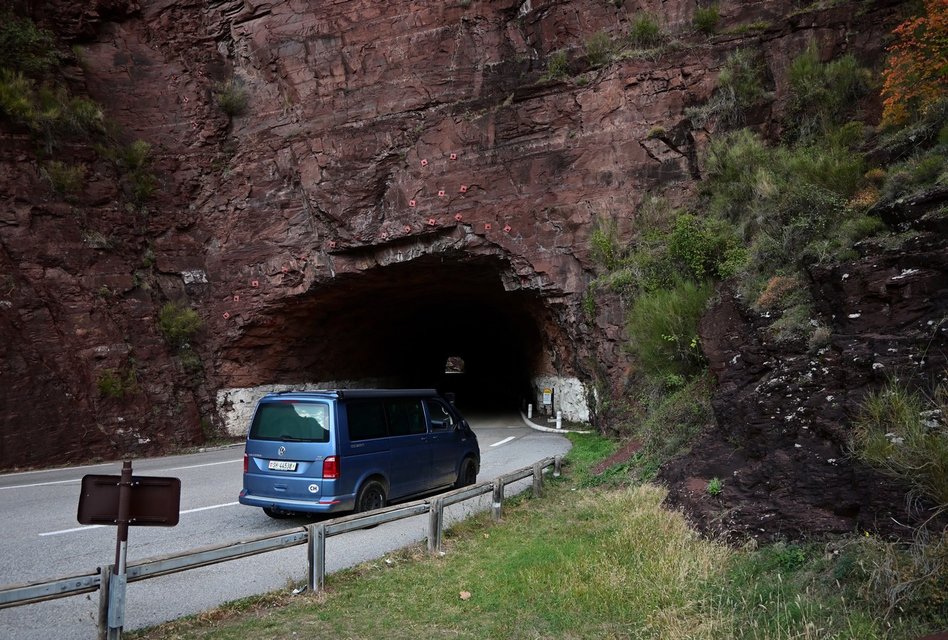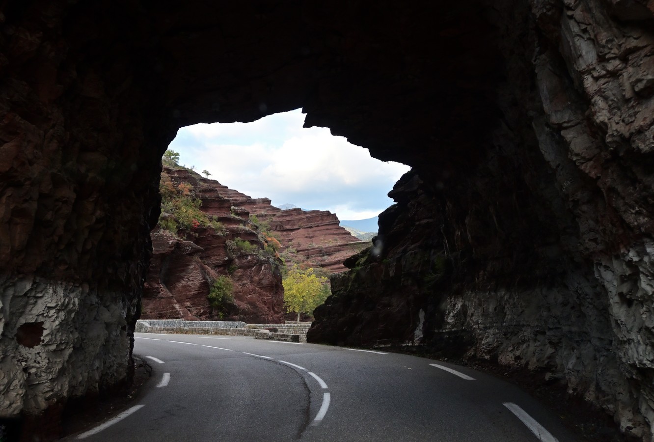 In Anbetracht der fortgeschrittenen Zeit, durchfahren wir ohne die Besichtigung von Entrevaux von Süd nach Nord die «Gorges de Daluis». Rote bizarre Felsen durch die sich die Straße mit einigen Tunnels durchschlängelt. Wenn man von Süd nach Nord fährt, führt die Spur rund um die Tunnels herum und man kommt der Ausblicke in die Schlucht näher. Von Nord nach Süd gehts durch 77 Tunnels. Leider ist die Sonne wegen der hohen Berge schon weg, aber die roten Felsen sehen dennoch imposant aus. Es gibt ein paar kleine Parkmöglichkeiten und diese nutzen wir natürlich.