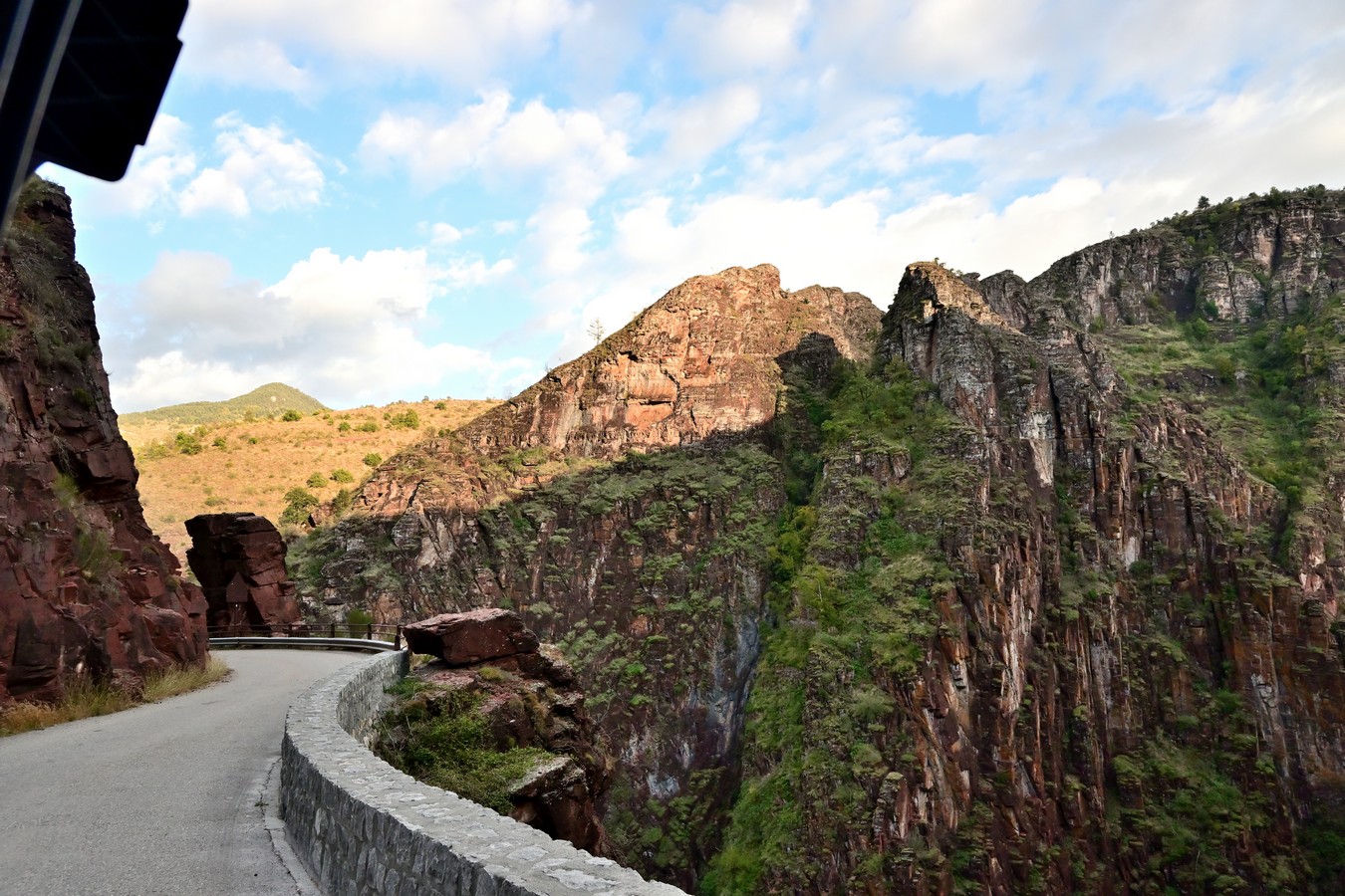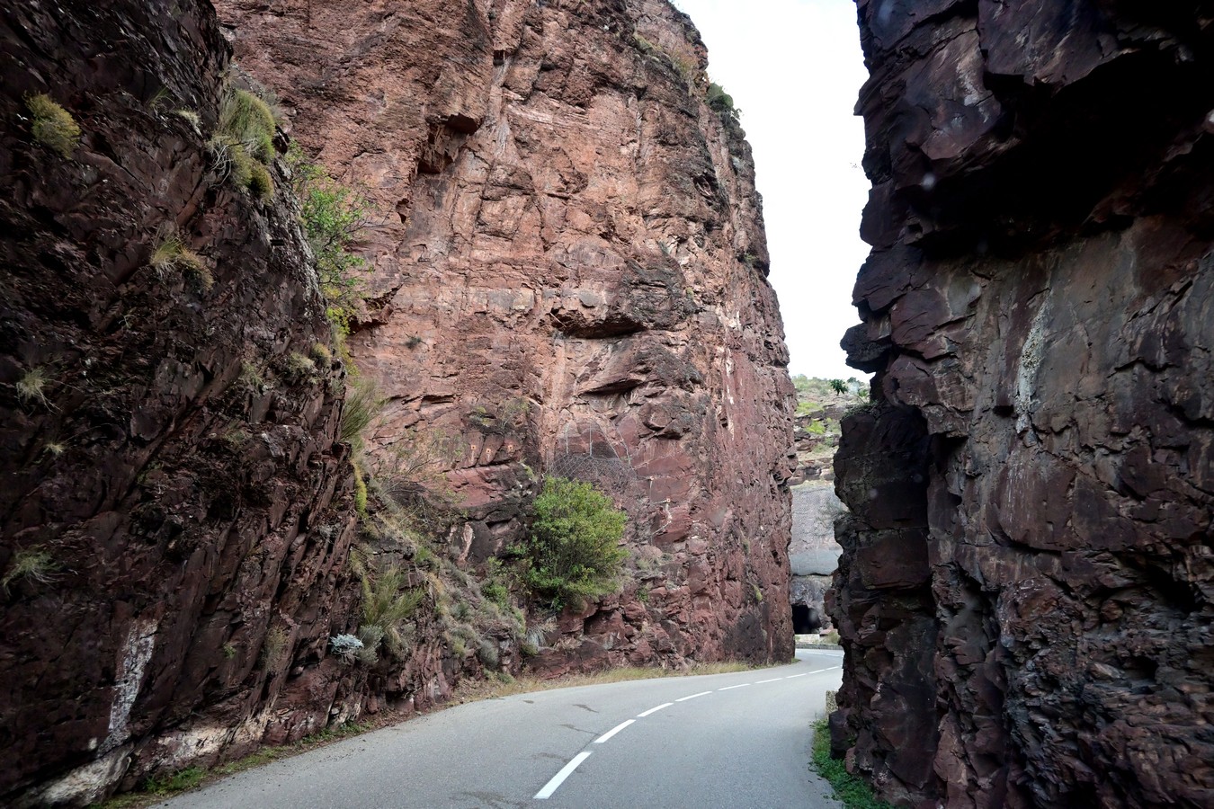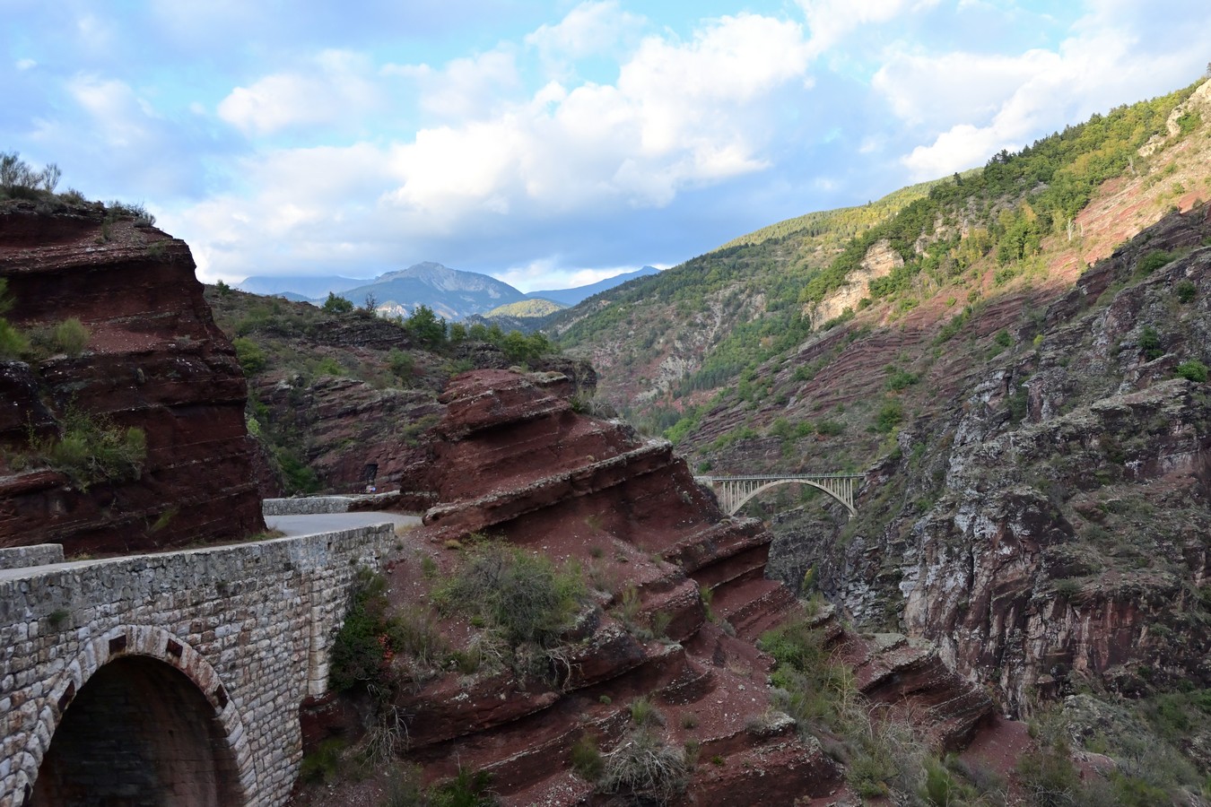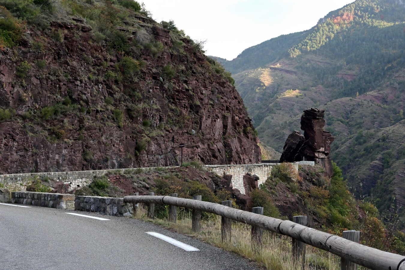 In Anbetracht der fortgeschrittenen Zeit, durchfahren wir ohne die Besichtigung von Entrevaux von Süd nach Nord die «Gorges de Daluis». Rote bizarre Felsen durch die sich die Straße mit einigen Tunnels durchschlängelt. Wenn man von Süd nach Nord fährt, führt die Spur rund um die Tunnels herum und man kommt der Ausblicke in die Schlucht näher. Von Nord nach Süd gehts durch 77 Tunnels. Leider ist die Sonne wegen der hohen Berge schon weg, aber die roten Felsen sehen dennoch imposant aus. Es gibt ein paar kleine Parkmöglichkeiten und diese nutzen wir natürlich.